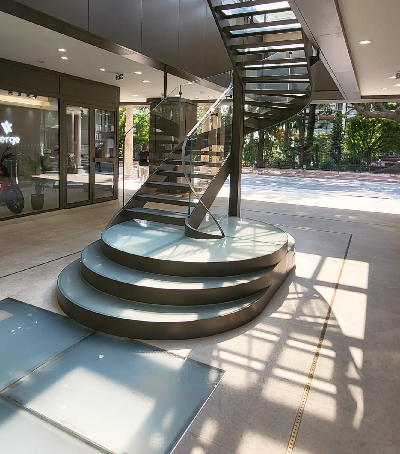 Scala elicoidale con doppio cosciale in ferro, gradino in vetro antiscivolo temperato e stratificato, corrimano in ferro.