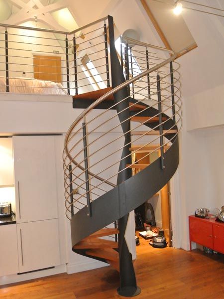 Spiral staircase with a more sophisticated style, centre pole, wooden steps and wrought iron railing.