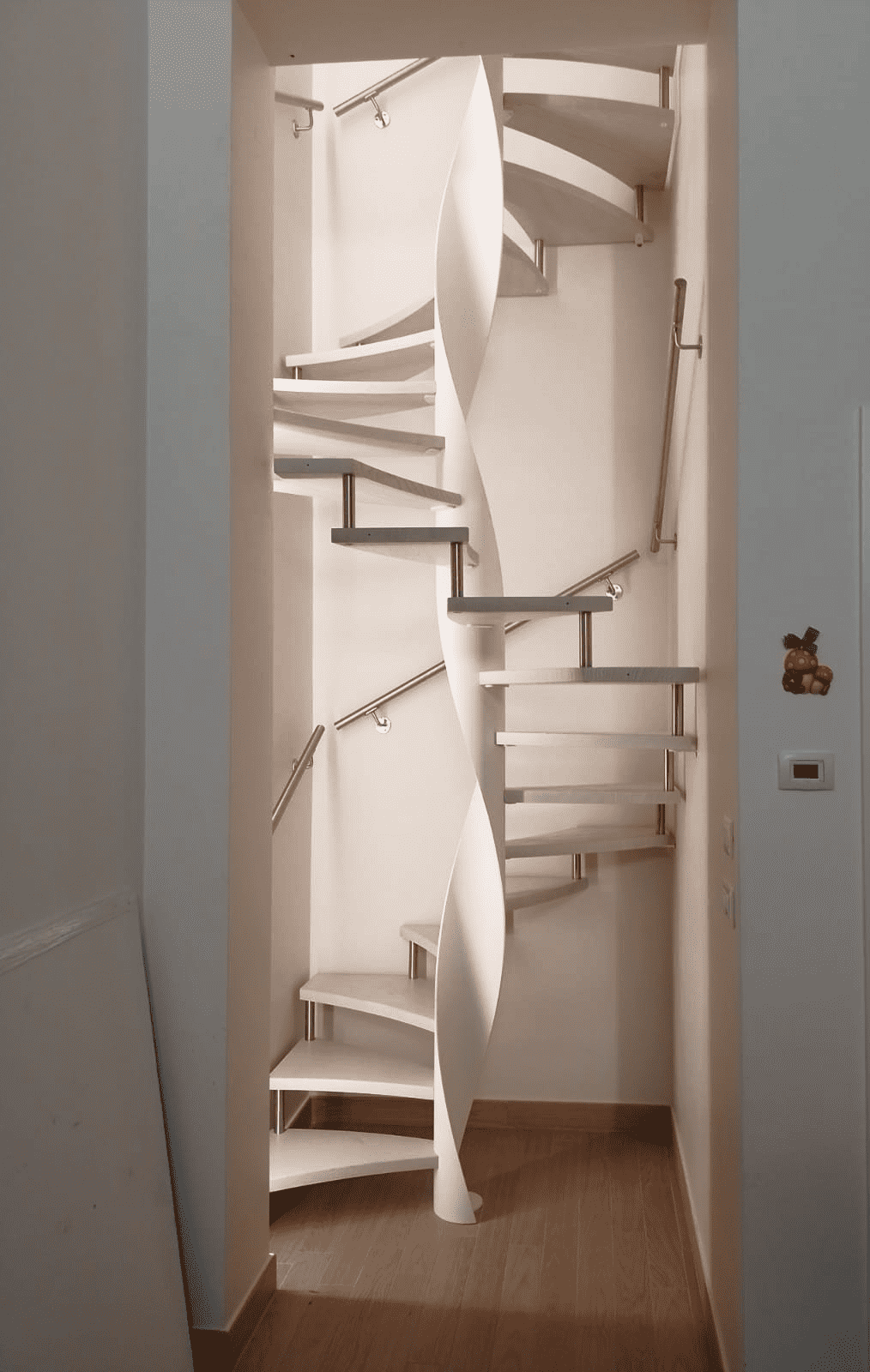Ciò permette di guadagnare diversi metri utili perché i gradini, più piccoli, vengono avvitati intorno ad un asse centrale rendendo la struttura adatta allo sviluppo in altezza.