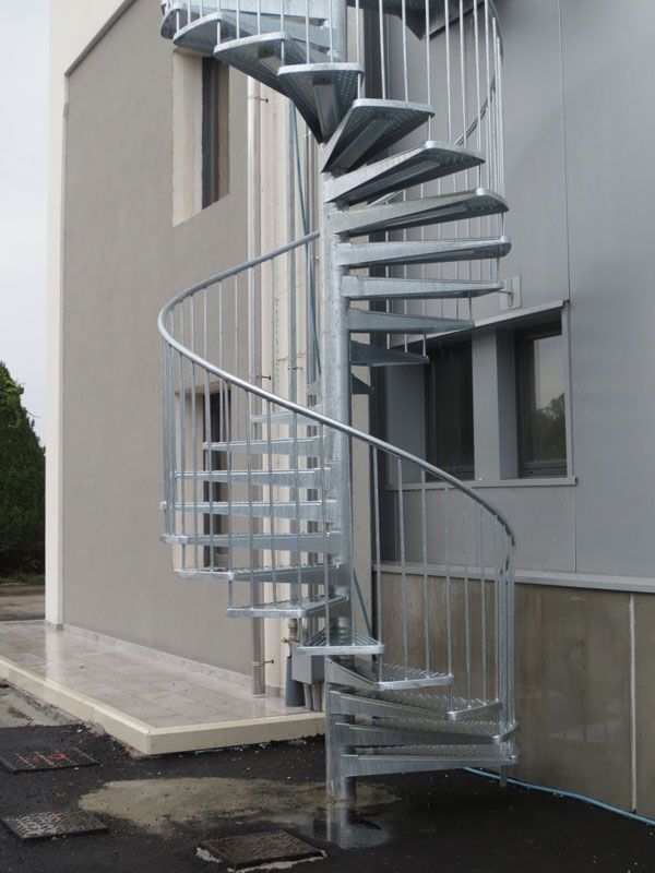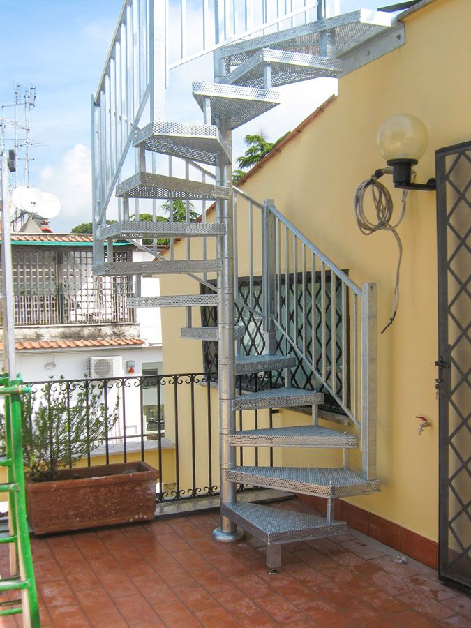 Scala a chiocciola per esterno, zincata a caldo, a pianta rotonda , realizzata in lamiera stampata con fori antiscivolo verso l’alto e fori per scolo dell’acqua verso il basso.