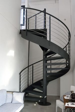 Scala a chiocciola dalle linee essenziali e moderne, realizzata interamente in ferro, adatta a qualunque tipo di ambiente.