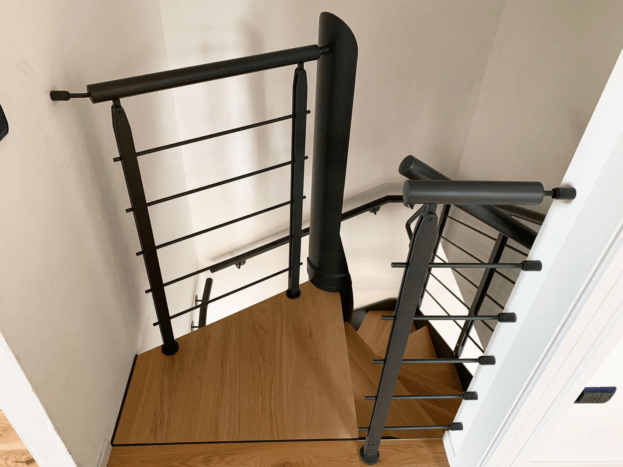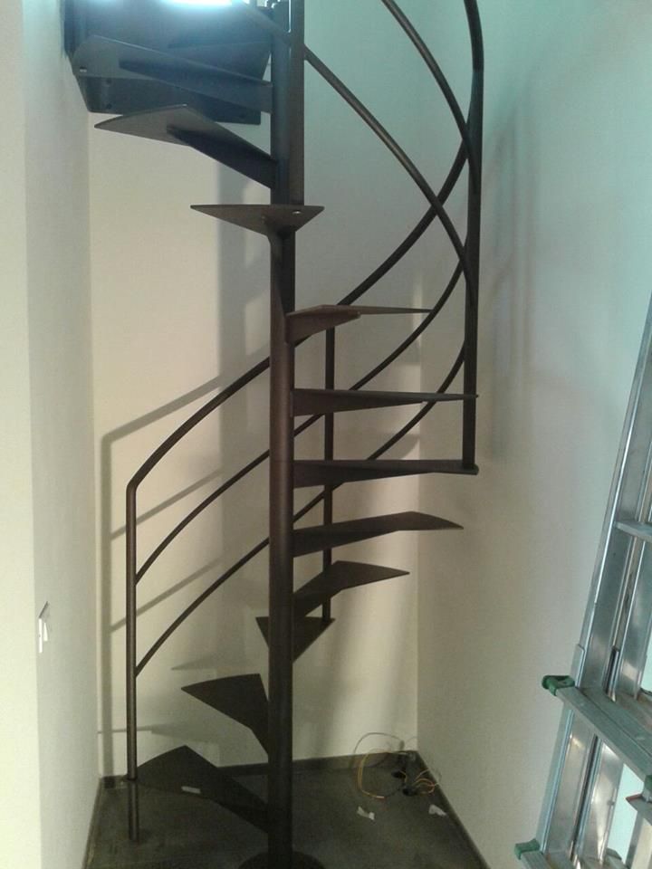 Scala a chiocciola palo in acciaio inox, puntalini in ferro, corrimano e colonne in ferro, tondini inox, gradini in legno.