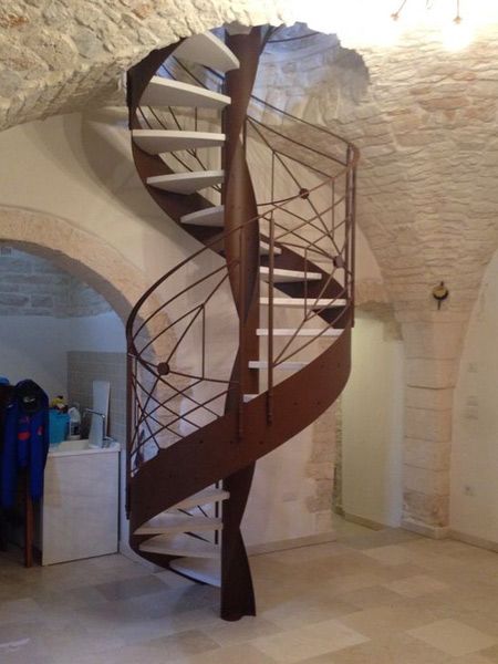 Scala a chiocciola di grande impatto, caratterizzata da un palo spiralato centrale in ferro, gradini in legno e ringhiera in acciaio inox.