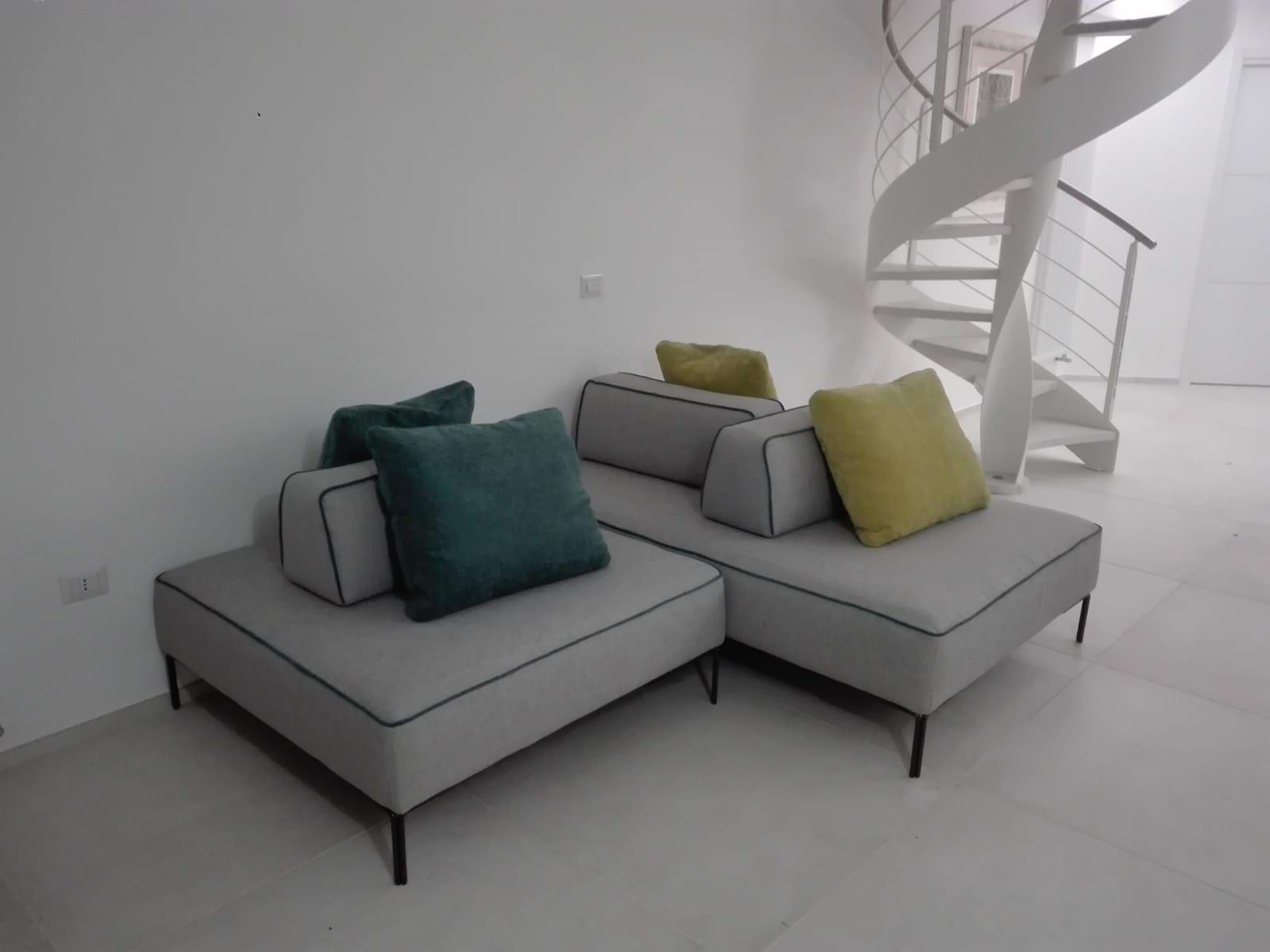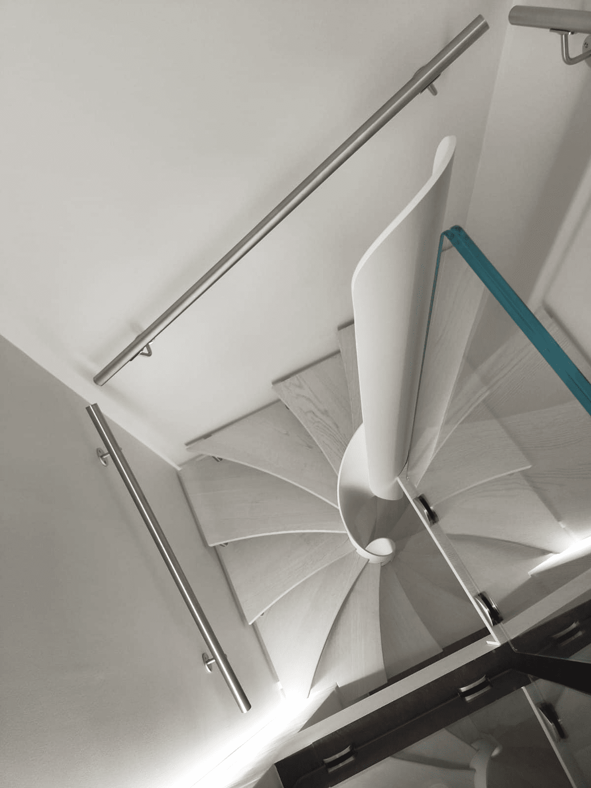 Scala a chiocciola con pianta a base rotonda, costituita da un palo centrale in acciaio inox, così come le ringhiere, caratterizzate da linee estremamente semplici.